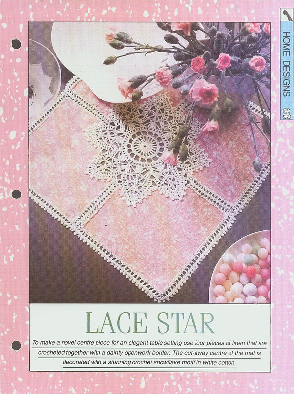 Crochet in size 10 crochet cotton. Stunning novel table centre piece. 4 pieces of linen are crochet together with a dainty openwork border, Then cut away the centre of the mat to decorate with a stunning snowflake motif. Finished size 25cm x 25cm.